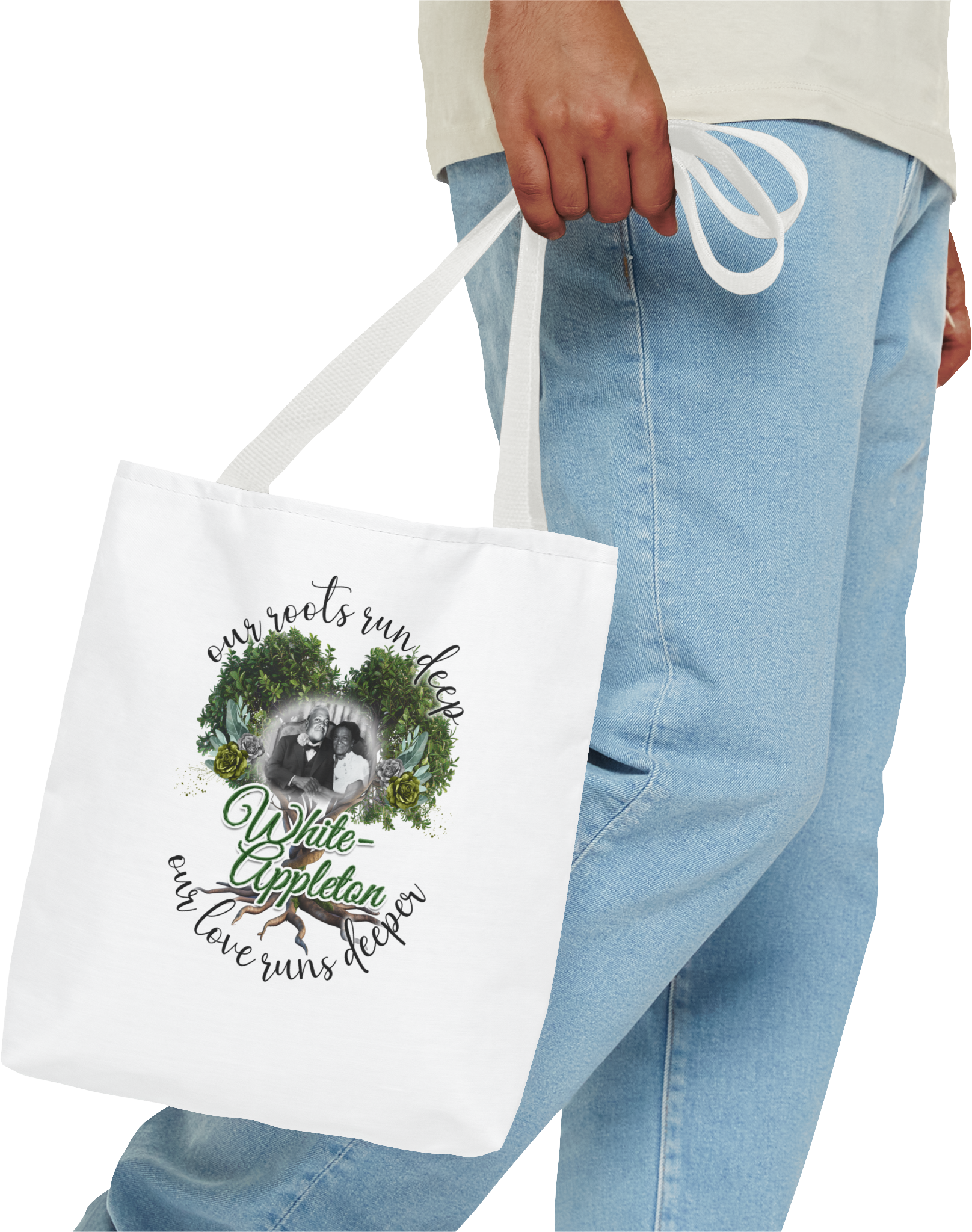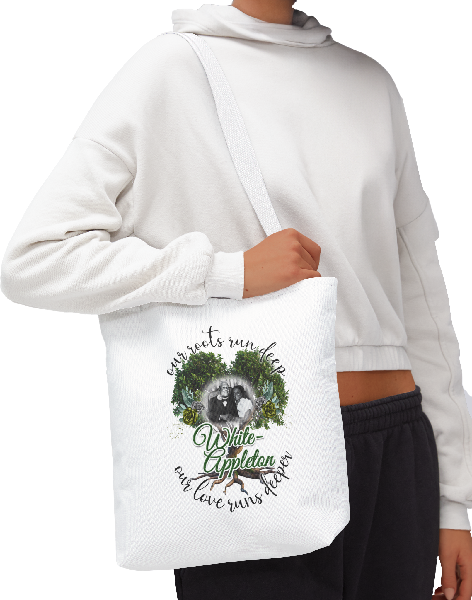 This durable, eco-friendly white canvas tote is printed with the heartfelt image of Marcellus White and Theodosha Appleton-White, surrounded by a tree of life and the phrase “Our Roots Run Deep, Our Love Runs Deeper.” Spacious and lightweight, it’s perfect for grocery runs, event giveaways, or everyday use — allowing you to carry not just your essentials, but your family's story with every step.